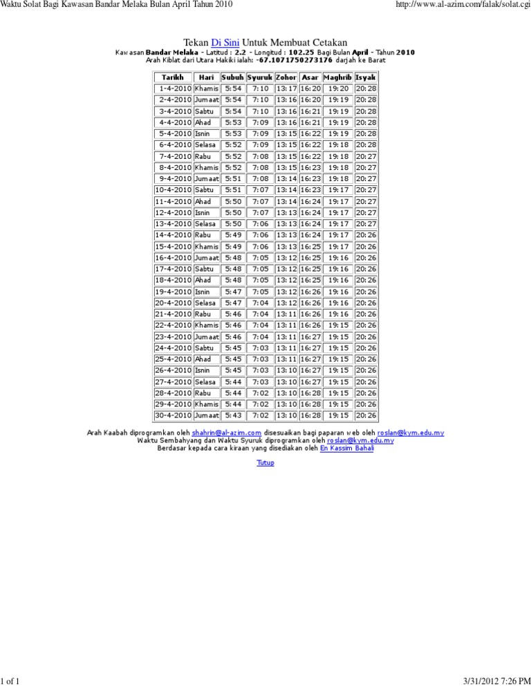 Waktu Solat Bagi Kawasan Bandar Melaka Bulan April Tahun 2010 Pdf